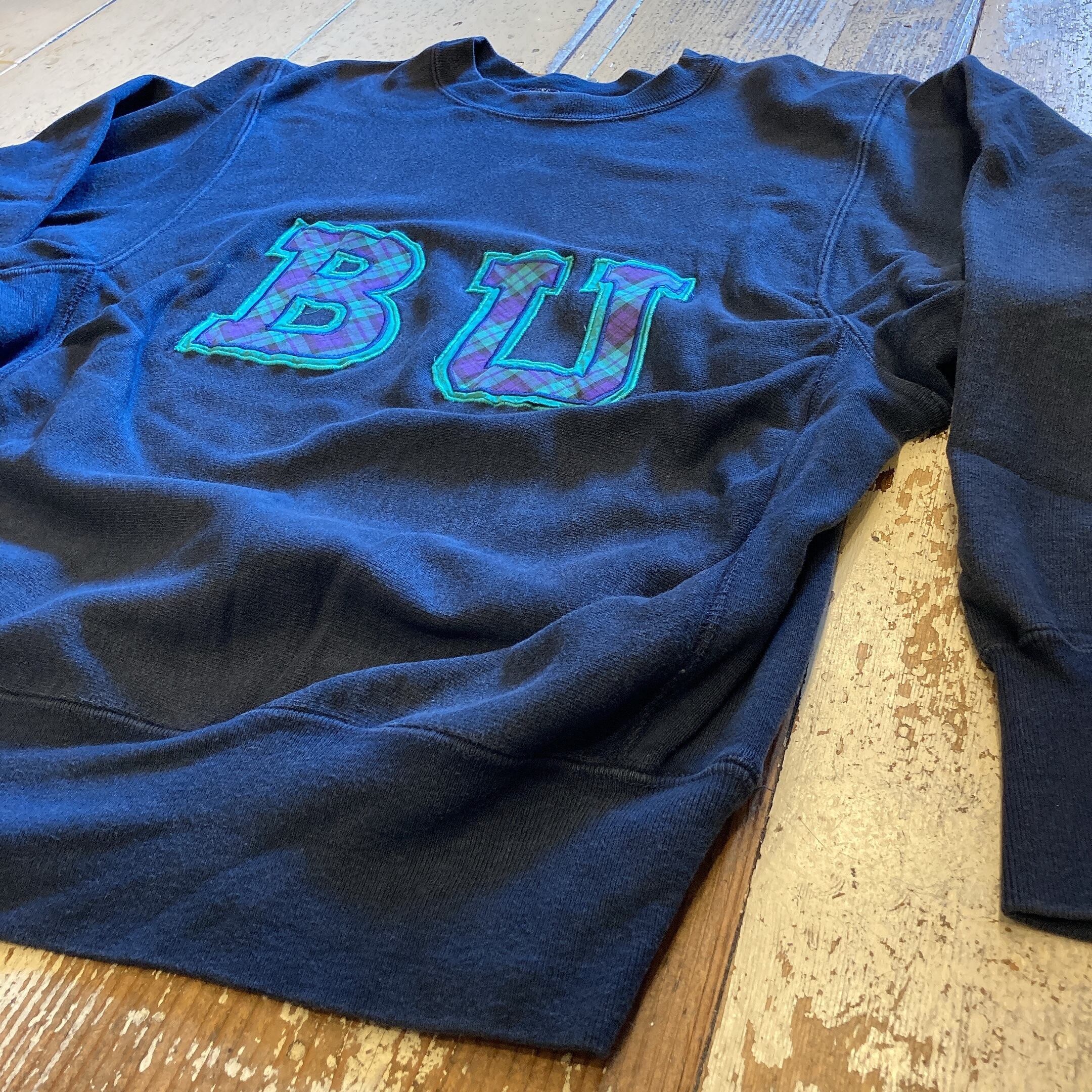 ややフェードしたネイビーボディにアルファベットのワッペンプリントが可愛い一枚です◎◎