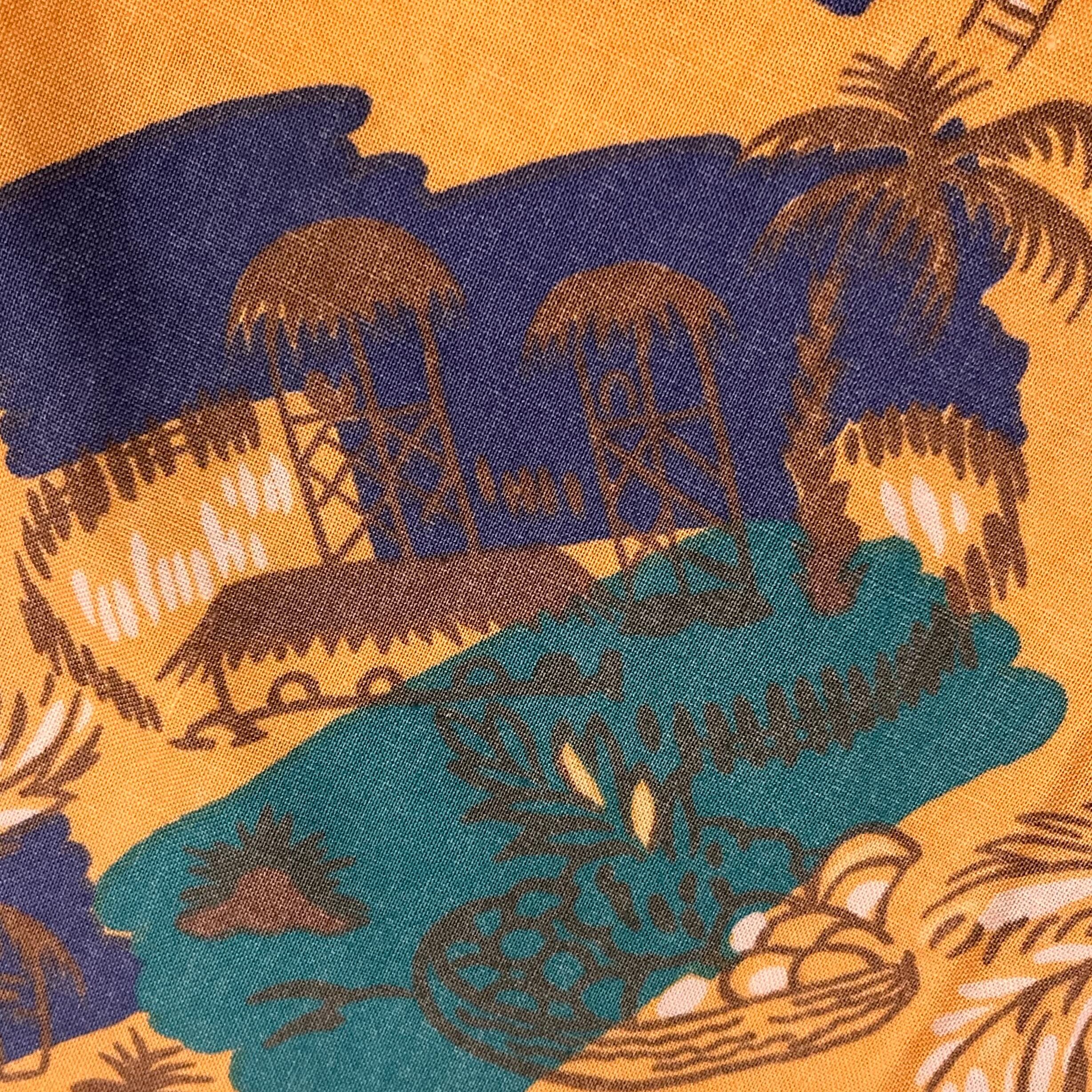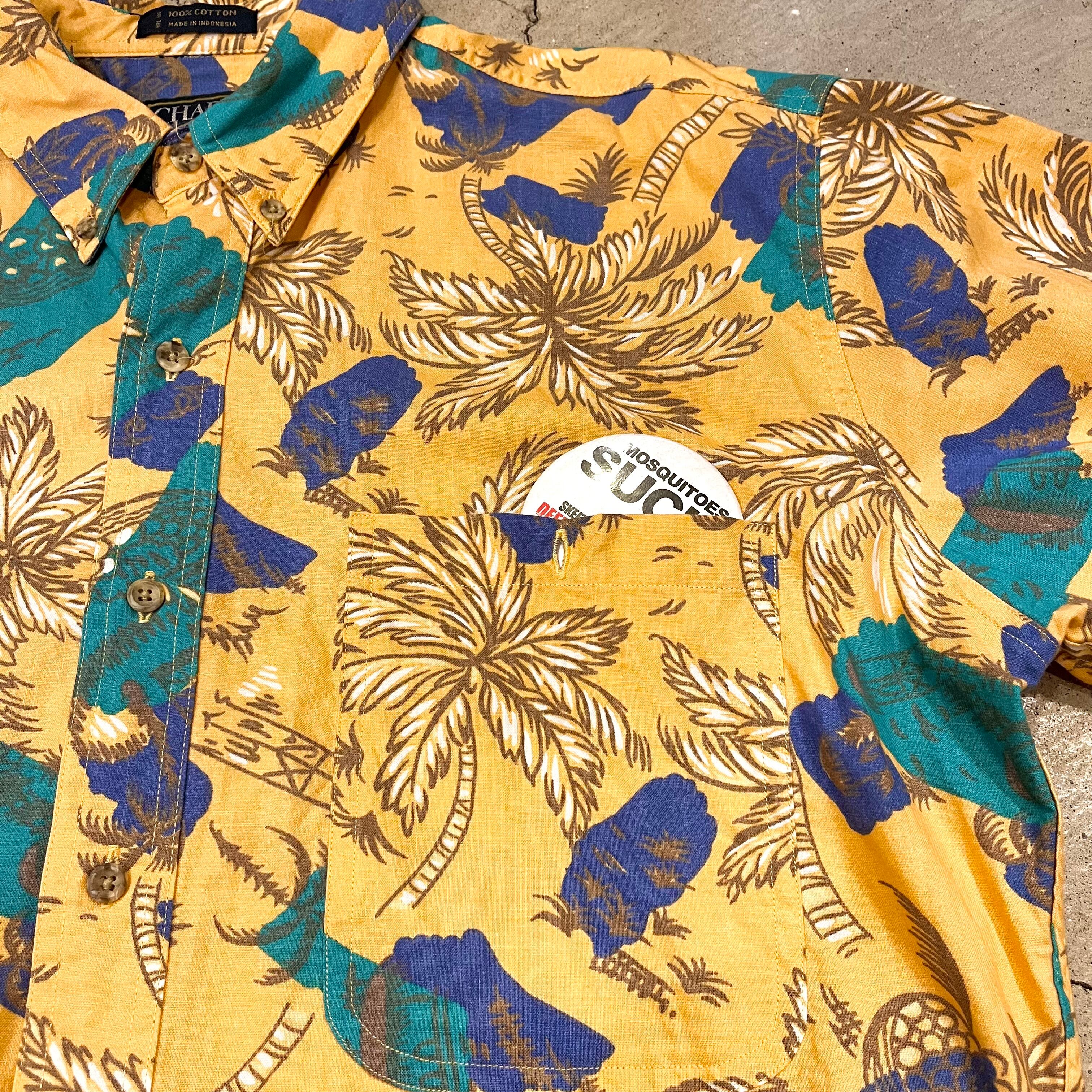 オレンジと黄色の間の様なボディに、ヤシの木やフルーツなどのデザインが入った夏らしいシャツ‼︎‼︎
