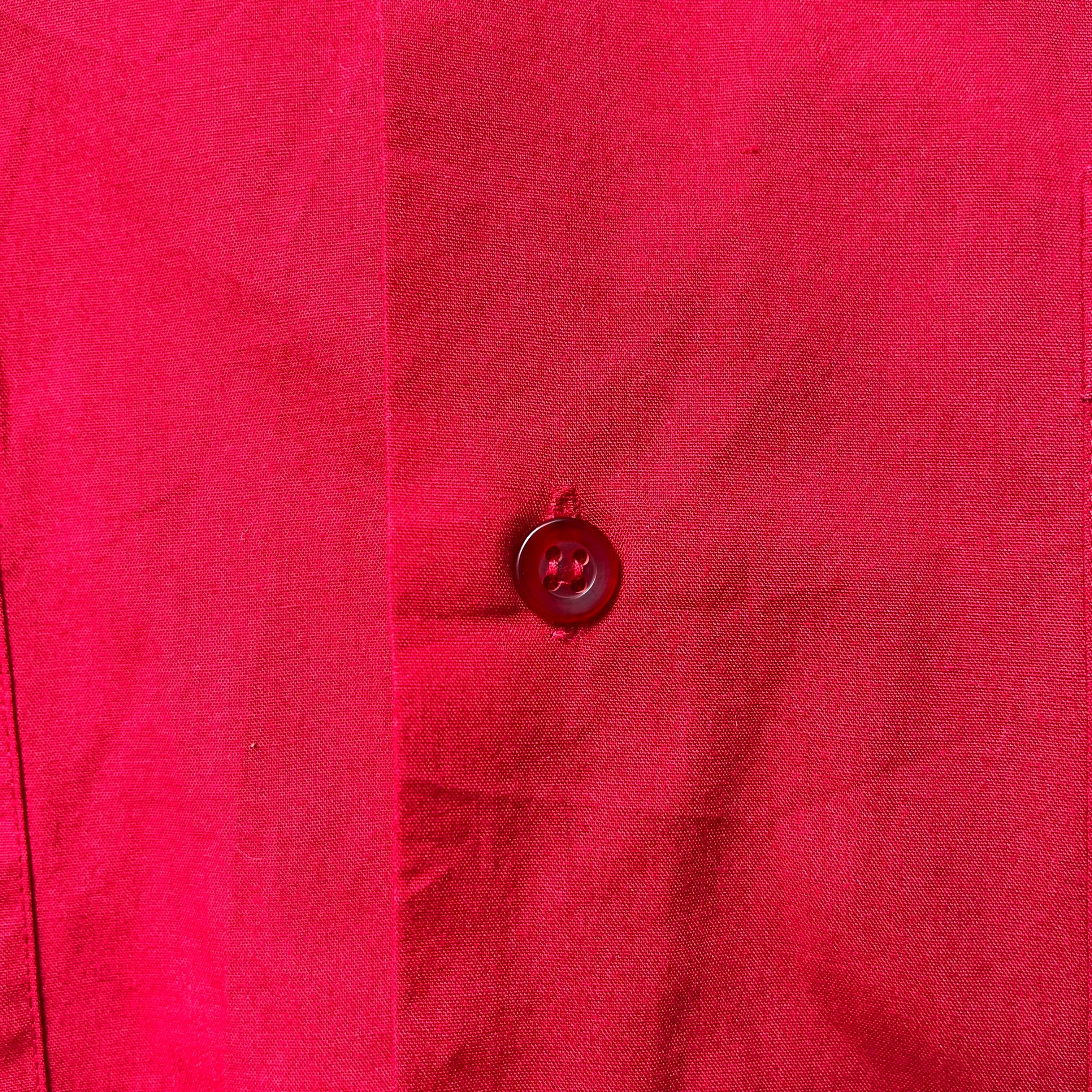 少し暗い赤色で、サイズ表記はLとやや大きめですが緩くラフに着てかっこいい一着かと。
